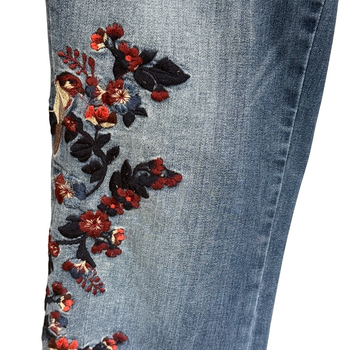 Beautiful Driftwood classic fit jeans with intricate floral embroidery. Designed in a timeless blue wash, these jeans feature a straight-leg cut and a touch of spandex for comfort.