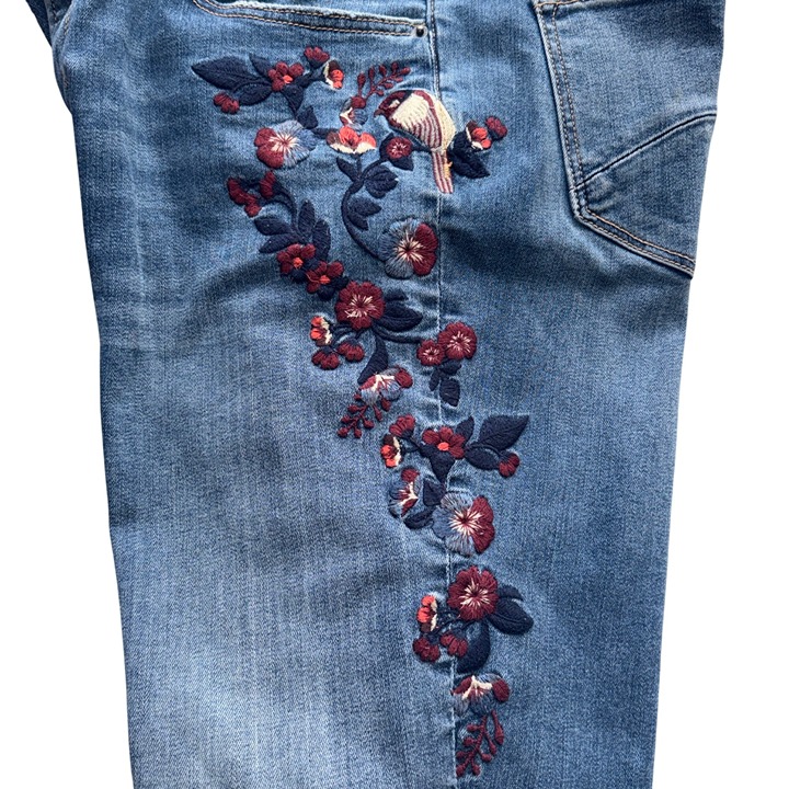 • Detailed floral embroidery on both legs