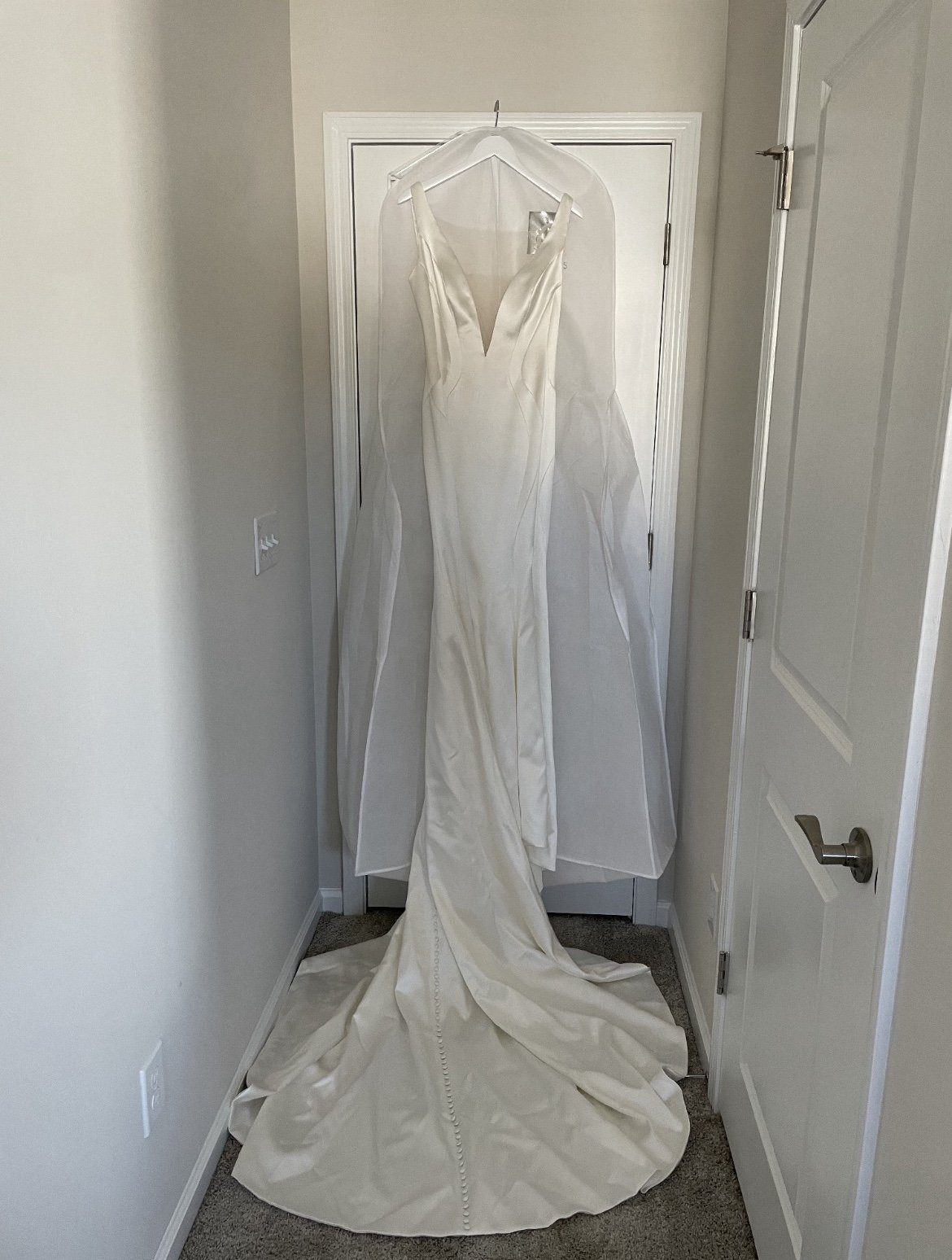 The Blaze Wedding Dress by Ines Di Santo is a sleeveless plunging V-neck trumpet gown with contoured seams, and a signature low back with a curved zipper. The material is a beautiful satin back crepe (also available in 4-ply silk and eco-friendly satin back crepe).
