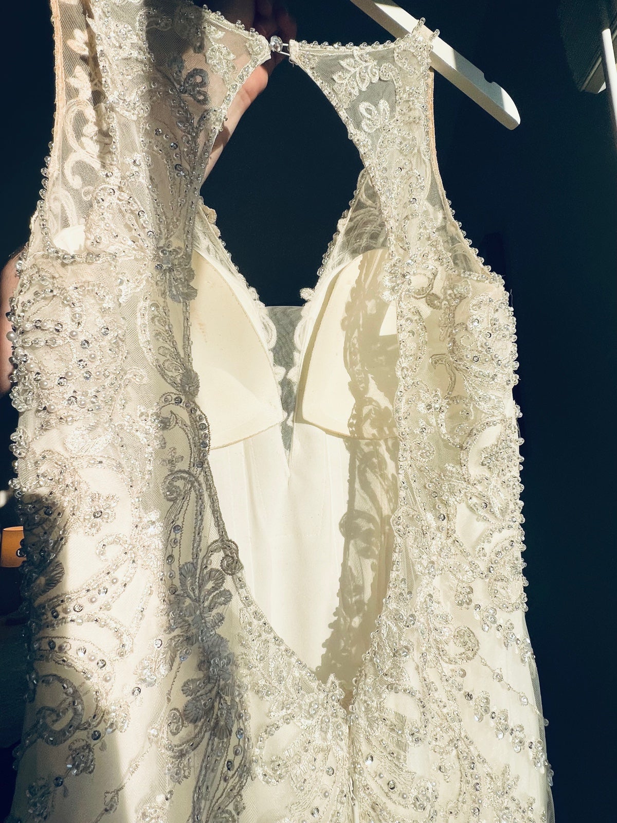 Originally purchased for $2249 at seng couture. Brand: Martin Thornburg. Listed as a size 12 but runs large (typically a size 8-10). Overall in good condition with some signs of wear: spray tan on inside lining of straps and back portion. Also some markings on the bottom lining of dress. Should come out with Dry cleaning. Very minor pulls in some areas. Signs of wear not noticeable when wearing dress.
