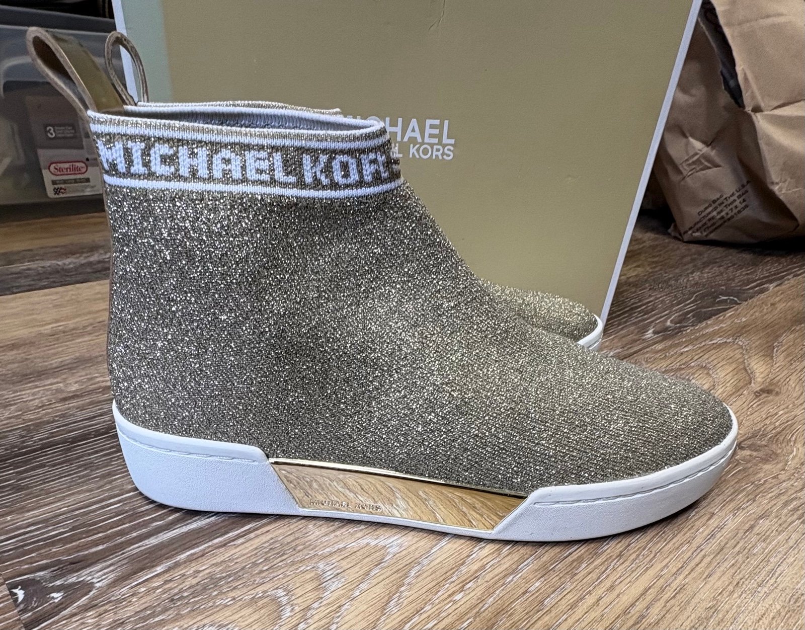 Michael Kors Grover Slip-On sneakers in gold metallic stretch fabric. Stylish and modern with a sock-fit design, worn only once and in excellent condition.
