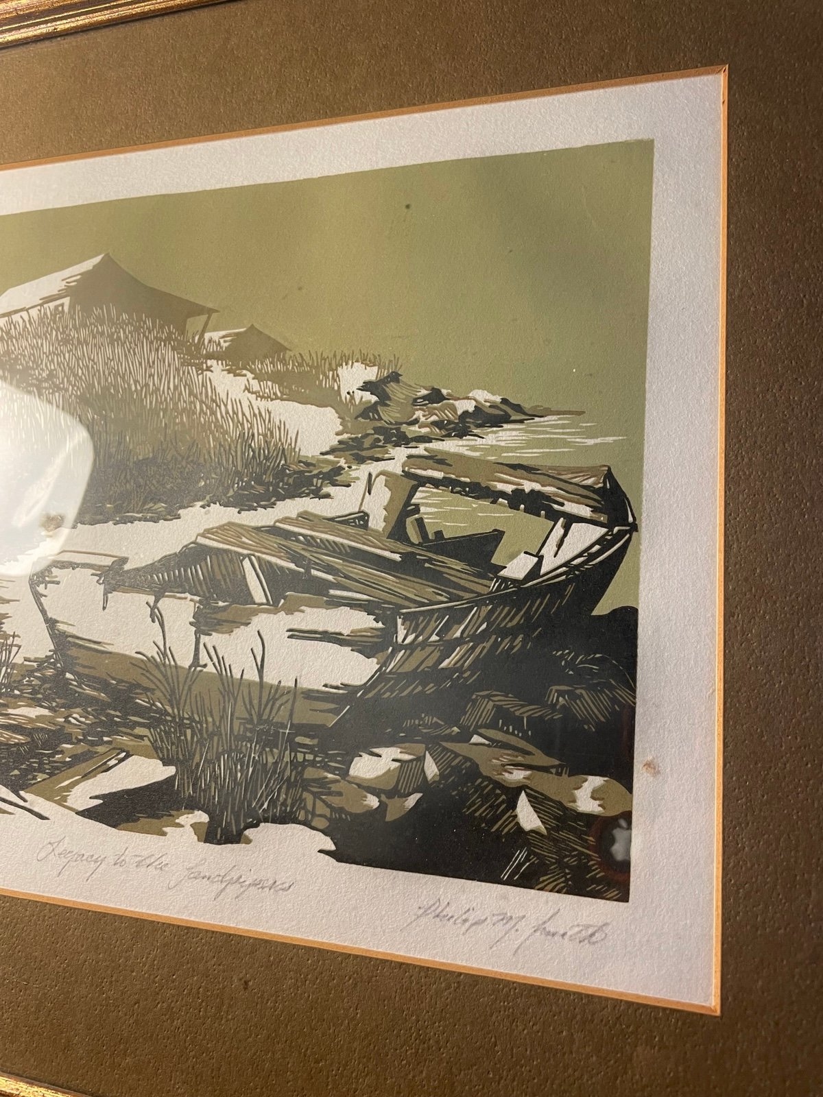 Original Signed Philip M. Smith Woodcut Print Artist Proof protected by Gold Gilt Wood Frame and matte