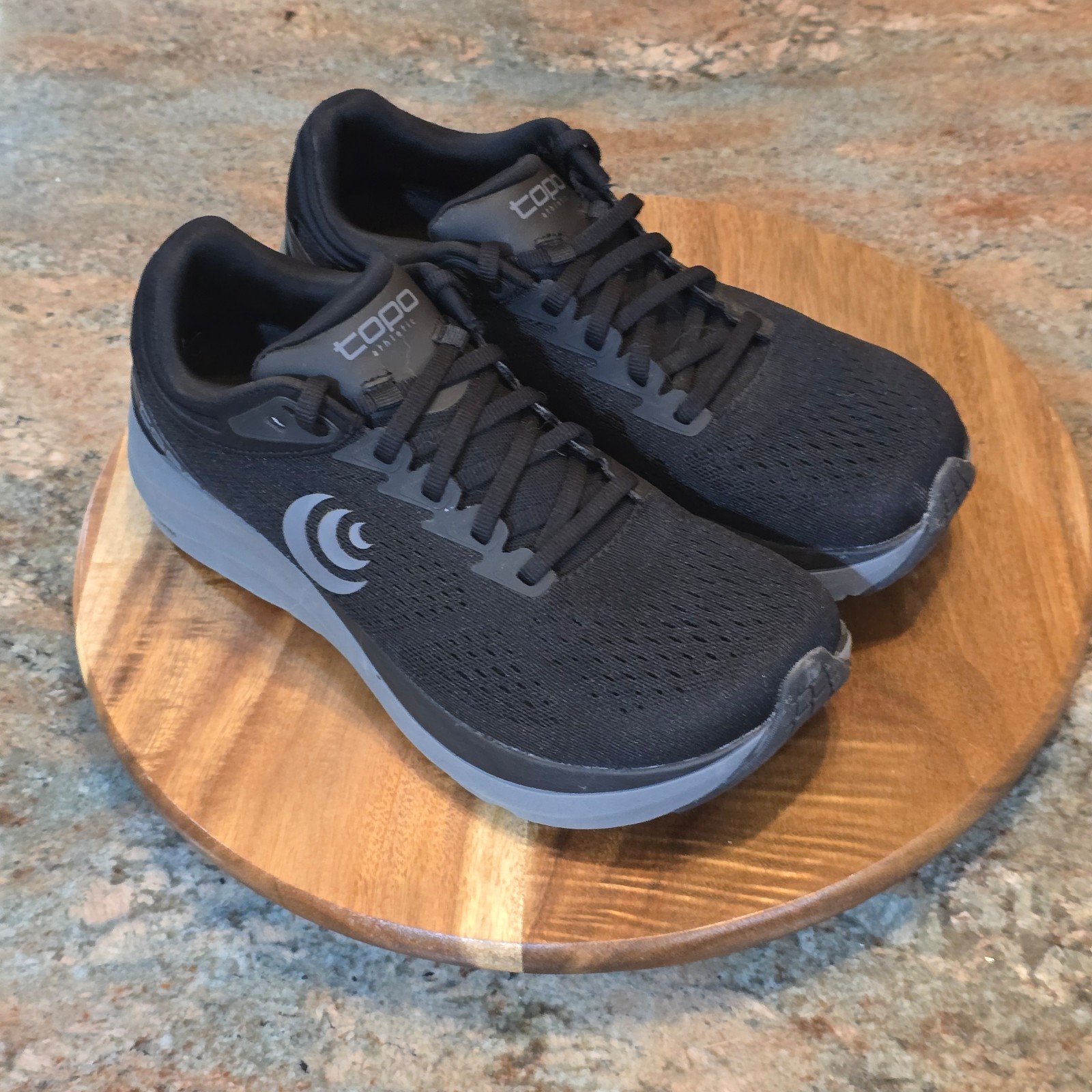 Topo Athletic Phantom 3 Black Athletic Road Running Training Shoes, women's size 7.5. Pre-owned in excellent condition with normal signs of very light wear. No holes, flaws, defects, etc. Tread has 90% life remaining. $145 retail.