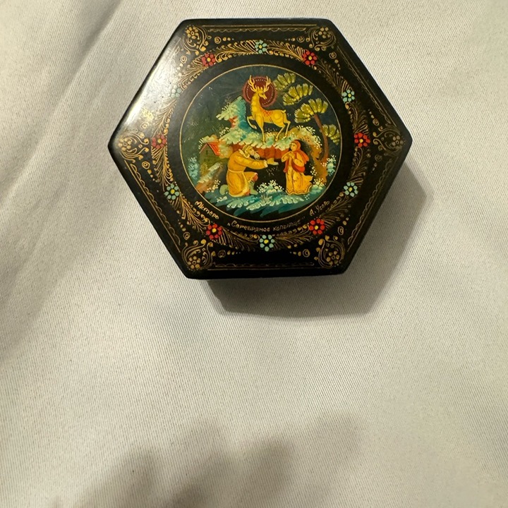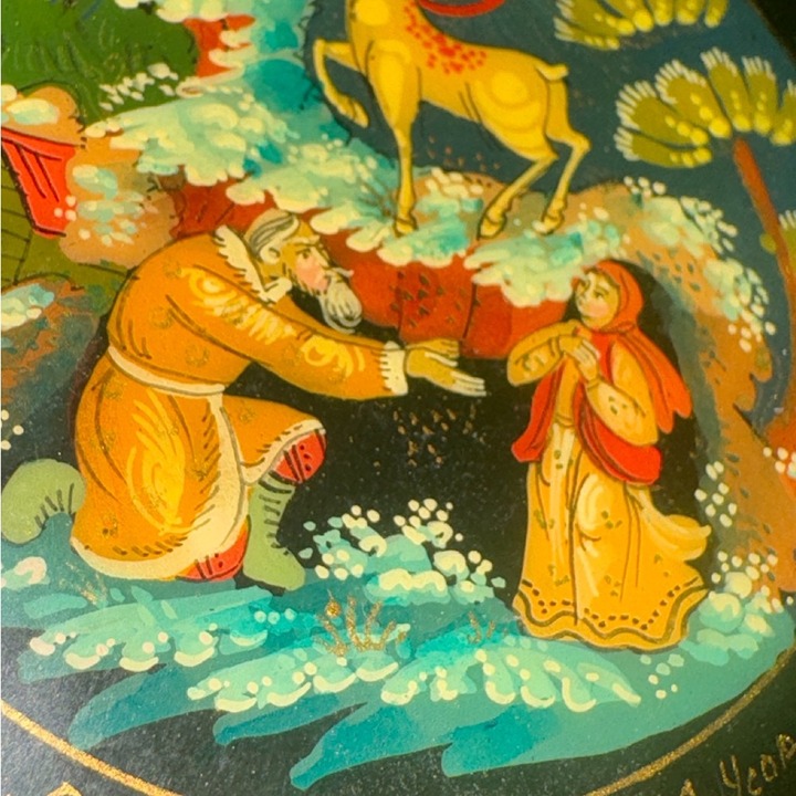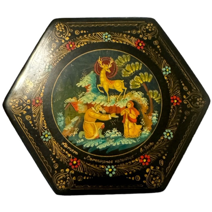 SizeRussian jewelry box hand painted in the unique Palekh style. The unbelievably colorful art of Palekh is known in all countries of the world. The elegant black-lacquered art pieces come to our life with the firebirds and troikas subjugated us with beauty of the fantastic world of Russian folk and admired us of harmony of their color chords. Red inside.